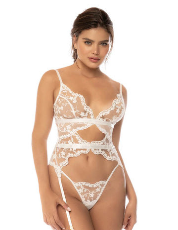 The set includes adjustable straps, built-in garters, and a matching thong.